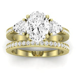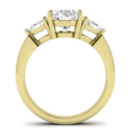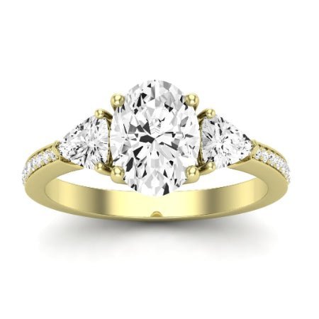 The secure prong setting showcases the included center stone and shoulder gems, allowing them to capture and reflect light beautifully.