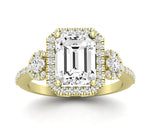 This Three Stone Halo Engagement Ring is a breathtaking testament to your love, designed to be cherished for a lifetime.