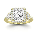 This Three Stone Halo Engagement Ring is a breathtaking testament to your love, designed to be cherished for a lifetime.