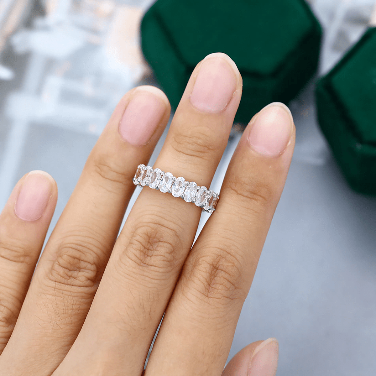 This oval cut diamond eternity band is the perfect symbol of everlasting love and commitment. With its stunning sparkle and elegant design, it will make your loved one feel cherished and special. A timeless piece that will be treasured for a lifetime.