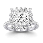 This exquisite engagement ring embodies modern elegance with a captivating halo design. A brilliant center gem is encircled by a halo of shimmering round side stones, creating a dazzling display of light and brilliance.