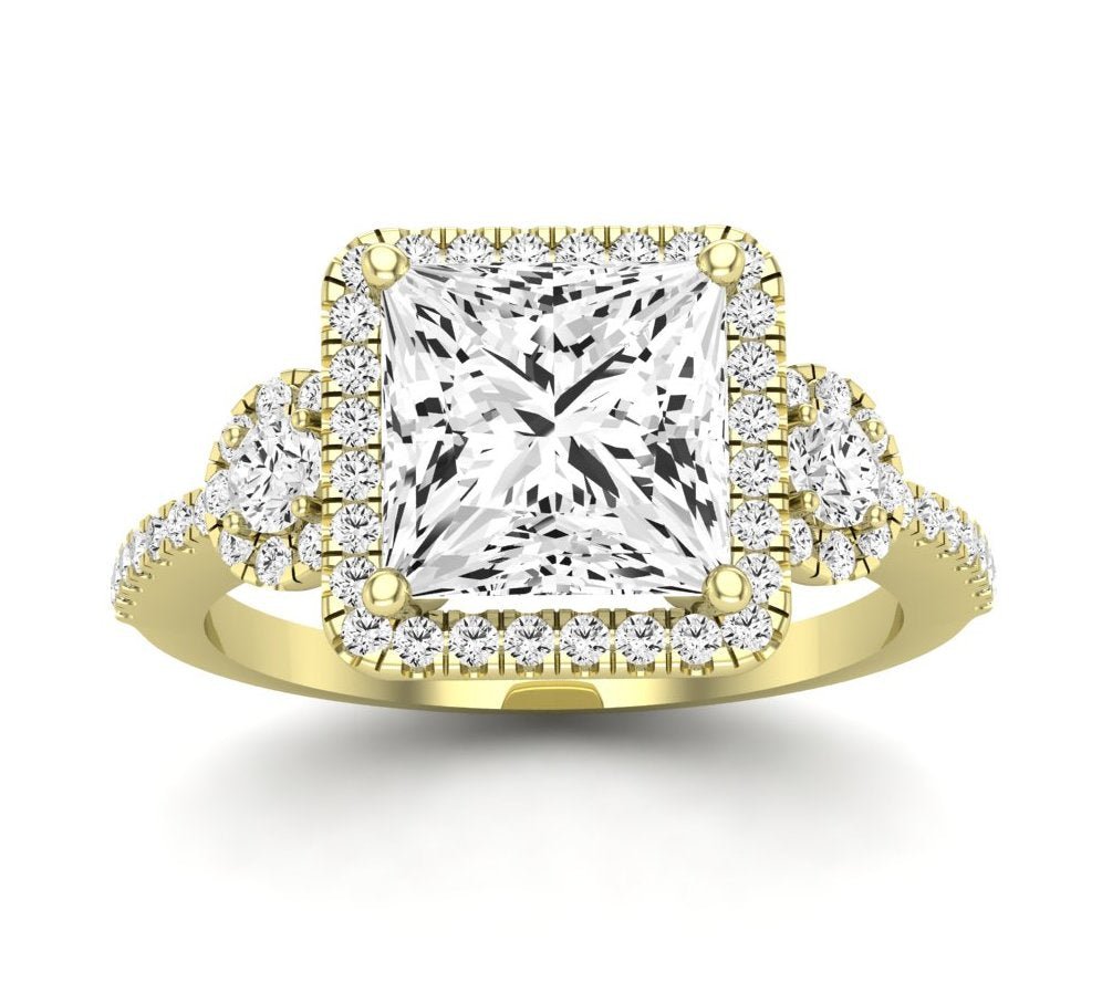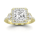 This Three Stone Halo Engagement Ring is a breathtaking testament to your love, designed to be cherished for a lifetime.