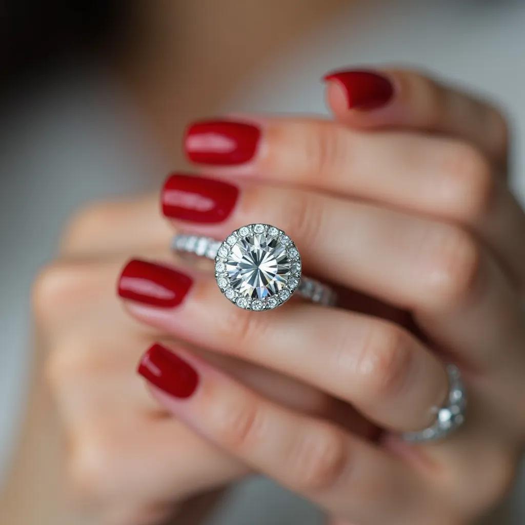 The classic halo design enhances the center stone's brilliance, creating a captivating display of light.