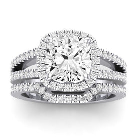 This Exquisite Double Row Pave Moissanites Cushion Moissanite Engagement Ring Is Extraordinary. This Cushion Ring Features A Stunning Side Moissanite That Sparkles And Shines From All Angles. This Ring Is Available In 14k, 18k Gold And Platinum.