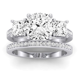 Delicately Crafted, This Three-stone Setting Engagement Ring Has A Round Cut Moissanite Set On Each Side Of The Center Stone. This Timeless Ring Boasts A Large Center Moissanite With Two Smaller Moissanites. This Princess Engagement Ring Is Available In 14k, 18k Gold And Platinum.