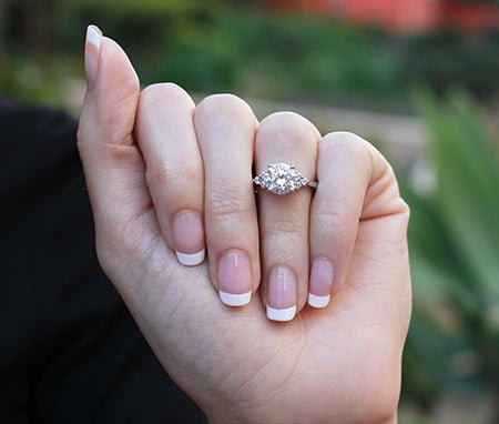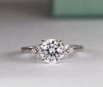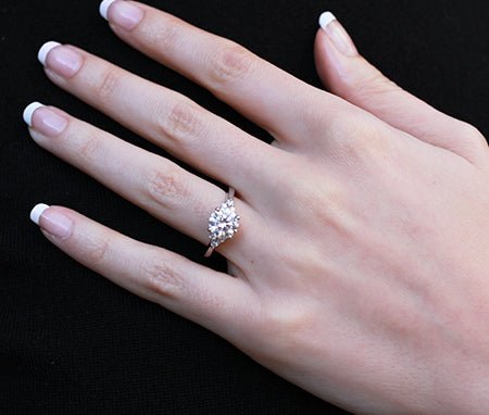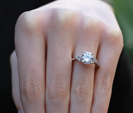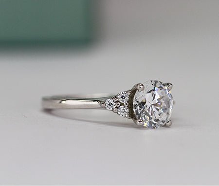 • Dazzling Accents: The ring features a classic prong setting, showcasing the brilliance of the center gem. Each shoulder is adorned with a trio of smaller stones, adding extra sparkle and enhancing the overall design.