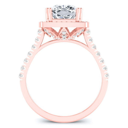 The Beauty Of This Floating Cushion-cut Halo Moissanite Ring Is Second To None. This Ring Is Emphasized By A Frame Of Halo Moissanites And A Band Set With Even More French Pavé Moissanites. The Dazzling Sparkle Of The Moissanites Will Take Your Breath Away.