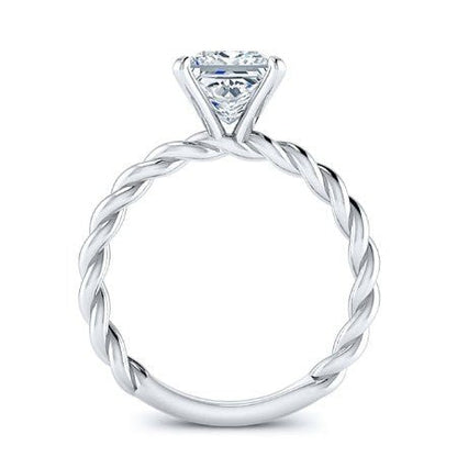 • The petite rope twist shank adds a touch of unique texture and visual interest to this otherwise classic design. The delicate rope-like pattern gracefully encircles the finger, creating a subtle yet captivating detail. The petite style of the shank ensures the focus remains on the center gem, while still offering a distinctive and refined look. This intricate detail symbolizes the intertwining of two lives, creating a beautiful and meaningful representation of your commitment.