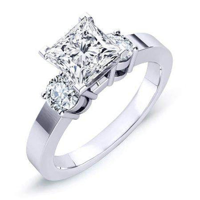 Delicately Crafted, This Three-stone Setting Engagement Ring Has A Round Cut Moissanite Set On Each Side Of The Center Stone. This Timeless Ring Boasts A Large Center Moissanite With Two Smaller Moissanites. This Princess Engagement Ring Is Available In 14k, 18k Gold And Platinum.