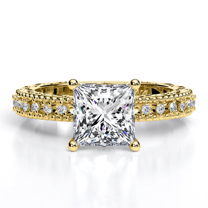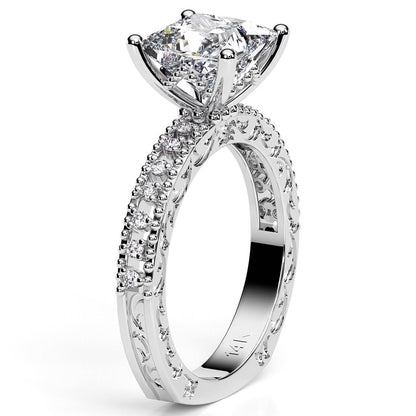 This exquisite engagement ring embodies the romance of a bygone era, blending vintage charm with modern elegance. It's a symbol of enduring love, crafted to capture her heart and sparkle for a lifetime. Imagine her delight as she beholds the intricate details and the radiant glow of this truly special piece.