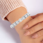 This Particular Round Tennis Bracelet Is No Ordinary Creation. This Has Halo Pieces Linked Together Bigger Pieces In Between. In The Center Of The Halo You Will Find An Round Shaped Stone Surrounded By Round Stones Around It To Give The Bracelet The Ultimate Shine. Choose From 3 To 10 Carat Total Weight.