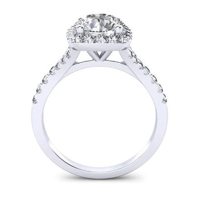 This exquisite engagement ring is a masterpiece of classic design, reimagined with a modern touch. Showcasing a captivating halo of shimmering round gems, this ring exudes a timeless elegance. The center stone is gracefully embraced by a sparkling pavé setting, creating a dazzling display of light and brilliance.