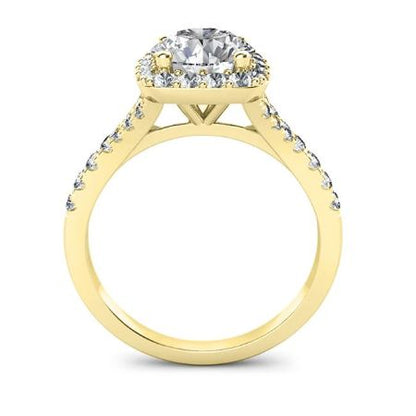This exquisite engagement ring is a masterpiece of classic design, reimagined with a modern touch. Showcasing a captivating halo of shimmering round gems, this ring exudes a timeless elegance. The center stone is gracefully embraced by a sparkling pavé setting, creating a dazzling display of light and brilliance.