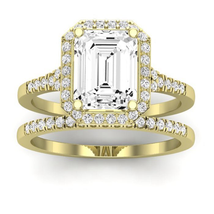 This exquisite engagement ring is a masterpiece of classic design, reimagined with a modern touch. Showcasing a captivating halo of shimmering round gems, this ring exudes a timeless elegance. The center stone is gracefully embraced by a sparkling pavé setting, creating a dazzling display of light and brilliance.