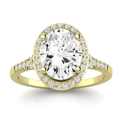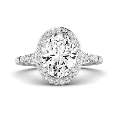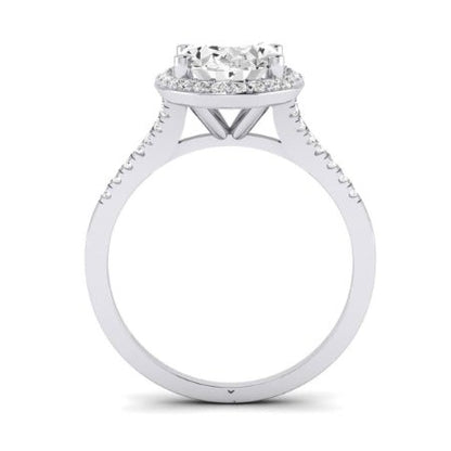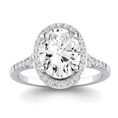 This exquisite engagement ring is a masterpiece of classic design, reimagined with a modern touch. Showcasing a captivating halo of shimmering round gems, this ring exudes a timeless elegance. The center stone is gracefully embraced by a sparkling pavé setting, creating a dazzling display of light and brilliance.
