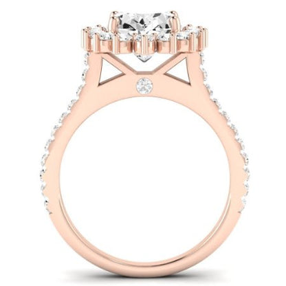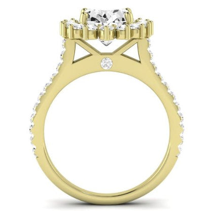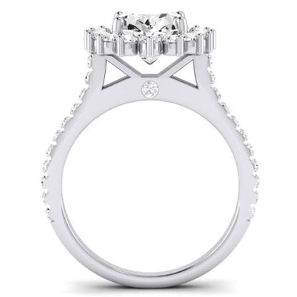 This exquisite engagement ring embodies modern elegance with a captivating halo design. A brilliant center gem is encircled by a halo of shimmering round side stones, creating a dazzling display of light and brilliance.