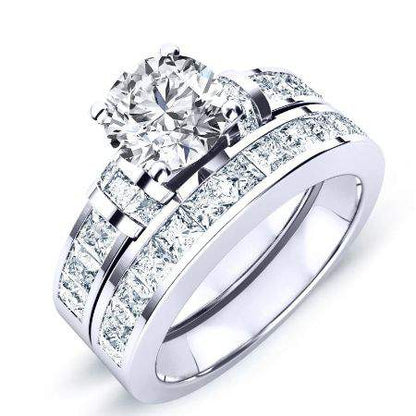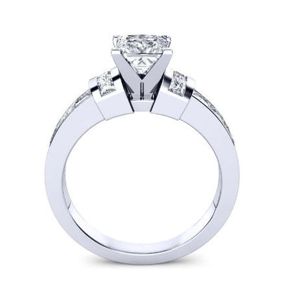 An Exquisite Bar Channel Set Round Cut Moissanite Ring With Princess Side Stones From Our Latest Collection. The Ring Is Crafted In Lustrous 14k, 18k Gold And Platinum. This Engagement Ring Is Sure To Be Treasured For A Lifetime.