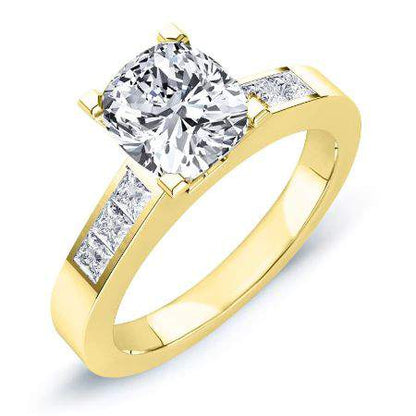 Enhancing The Glory And Dazzle Of The Sparkles, This Tapered Four Prong Cushion With Channel Set Engagement Ring Display A Cushion Cut Center Stone And Three Moissanites Arranged On Each Side. This Enchanting Channel Setting Engagement Ring Is Truly Breathtaking.