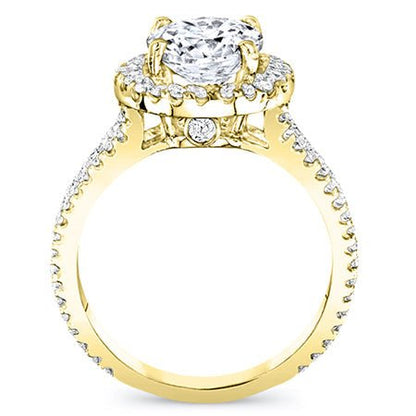 Be Dazzled By This Elegant Halo Engagement Ring With Peekaboo Set Side Stone. This Ring Has A Split Shank Style Filled With Round Shape Side Stones Along The Halo And The Band. It Is A Unique Feature That Will Surely Make Her Heart Melt. Customize It With Your Own Choice Of Center Stone Size And Order It Today.