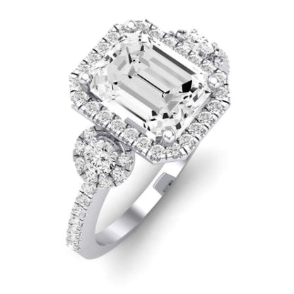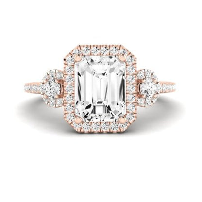 This Three Stone Halo Engagement Ring is a breathtaking testament to your love, designed to be cherished for a lifetime.