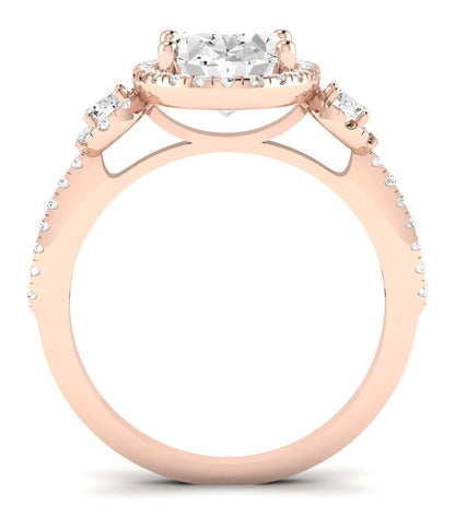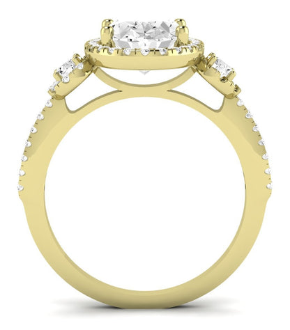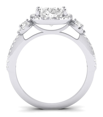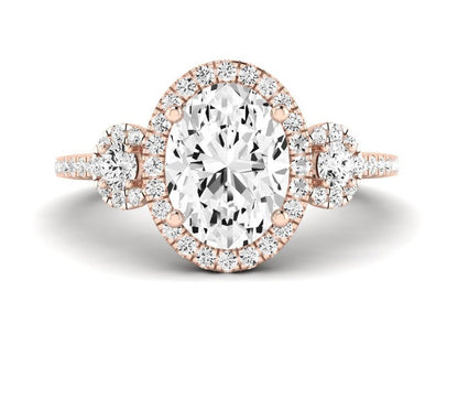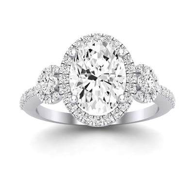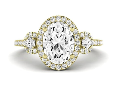This Three Stone Halo Engagement Ring is a breathtaking testament to your love, designed to be cherished for a lifetime.