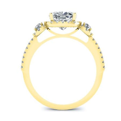This Three Stone Halo Engagement Ring is a breathtaking testament to your love, designed to be cherished for a lifetime.