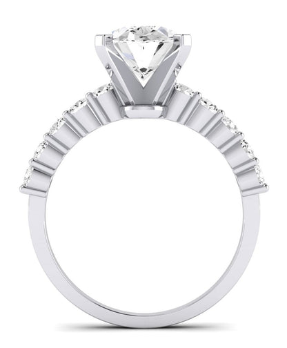 The focal point of this ring is undoubtedly the magnificent center gem, held securely in place by a classic prong setting. This setting allows maximum light to pass through the stone, enhancing its brilliance and fire. Adding to the allure are the meticulously matched side stones that adorn the band. These stones are set in a unique shared prong style, creating a seamless and dazzling flow of sparkle.