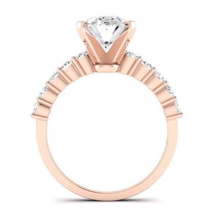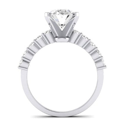 The focal point of this ring is undoubtedly the magnificent center gem, held securely in place by a classic prong setting. This setting allows maximum light to pass through the stone, enhancing its brilliance and fire. Adding to the allure are the meticulously matched side stones that adorn the band. These stones are set in a unique shared prong style, creating a seamless and dazzling flow of sparkle.