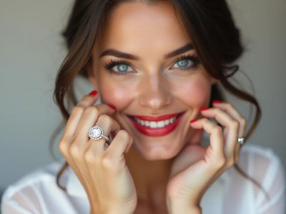 • Pavé Setting: The pavé setting meticulously secures accent gems, creating a continuous sparkle around the halo and band.