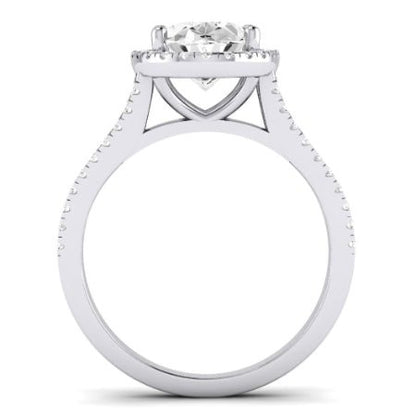 • The halo setting encircles the center stone with a ring of smaller pavé-set gems, enhancing its size and brilliance. This creates a dazzling display of light and fire, maximizing the overall sparkle of the ring. The classic halo design offers a timeless elegance that will never go out of style.