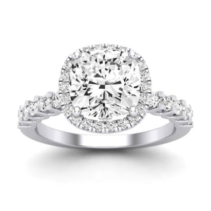 The classic halo design enhances the center stone's brilliance, creating a captivating display of light.