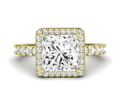 The classic halo design enhances the center stone's brilliance, creating a captivating display of light.