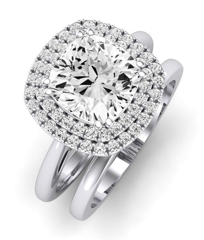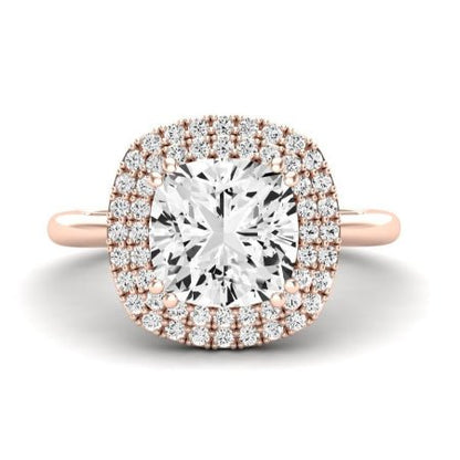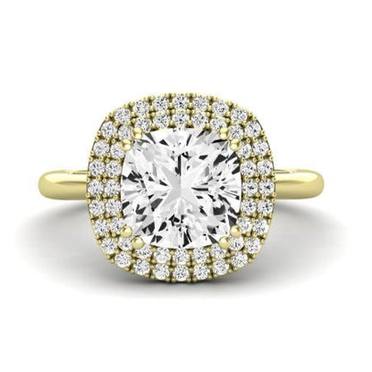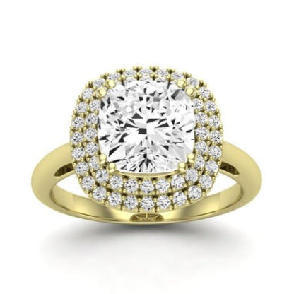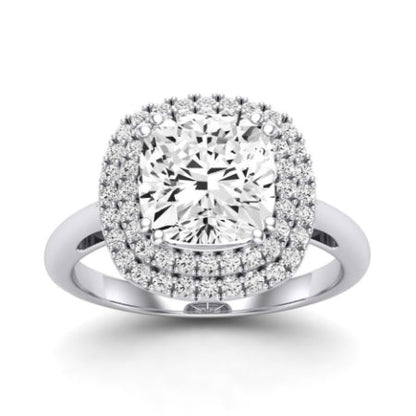 The plain petite shank provides a sleek and understated backdrop, allowing the double halo to take center stage. This design balances modern glamour with timeless elegance.