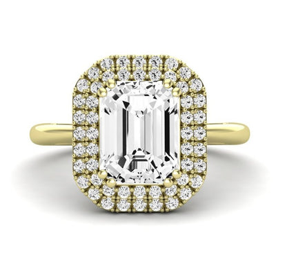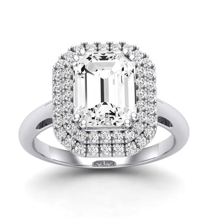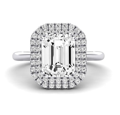 The plain petite shank provides a sleek and understated backdrop, allowing the double halo to take center stage. This design balances modern glamour with timeless elegance.