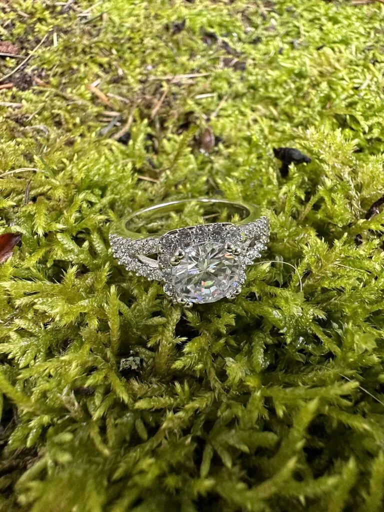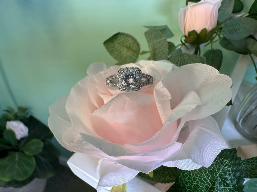 • Polished Finish: A high-polish finish ensures a radiant shine, highlighting the ring's intricate details and the brilliance of the center stone and pave gems.